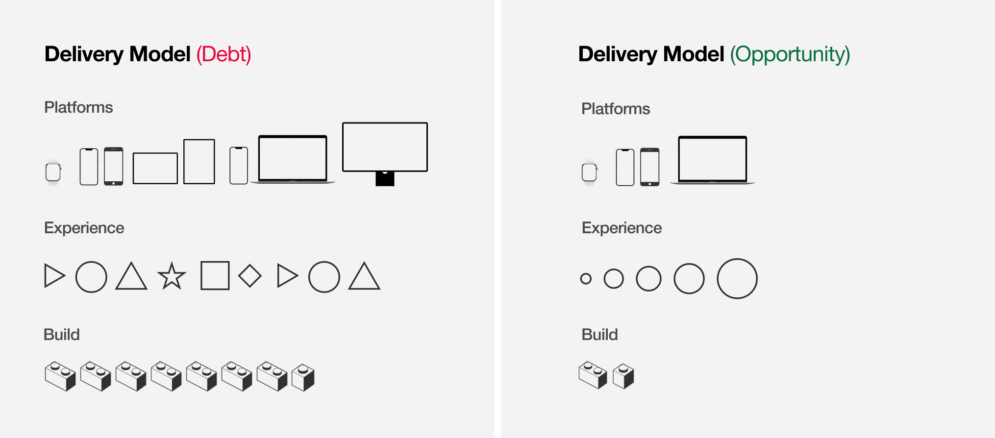 The fifteen-year accumulation of technical debt meant each platform required independent builds and bespoke solutions. Teams were recreating patterns and components across disconnected platforms for every release, driving inconsistency and slowing progress. To address this, I partnered with business, engineering, data and product to move from fragmented execution to consolidated build standards shared across platforms. This shift reduced structural complexity, eliminated redundant work, and enabled delivery of a unified experience across the ecosystem.